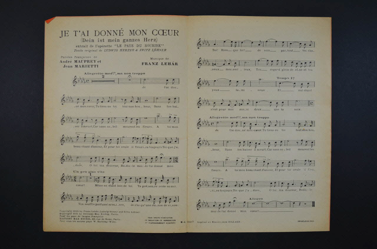 chanson, partition de musique, petit format, Je t'ai donné mon coeur (Dein ist mein ganzes Herz), Le pays du sourire
