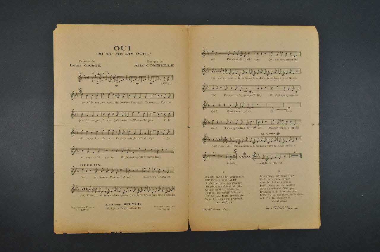 Les inscriptions renseignent le titre de la chanson, le nom des auteurs, de l'artiste et de l'éditeur. A l'intérieur, partition et paroles de la chanson. Au dos, liste d?autres partitions publiées par l?éditeur.Matériaux et techniques