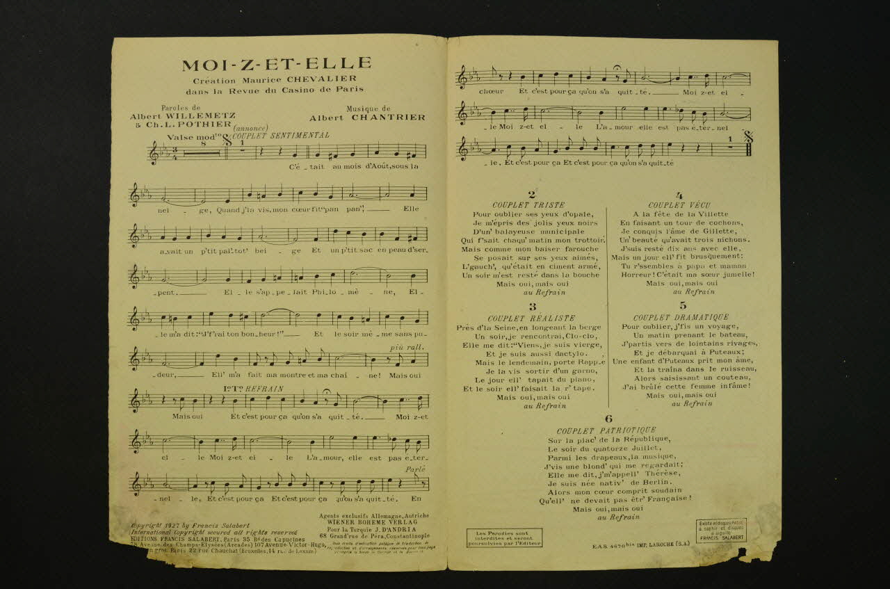 Feuillet rectangulaire en papier industriel imprimé à l'encre. L'intérieur comporte les paroles et la partition de la chanson. Au dos, publicité pour l'éditeur