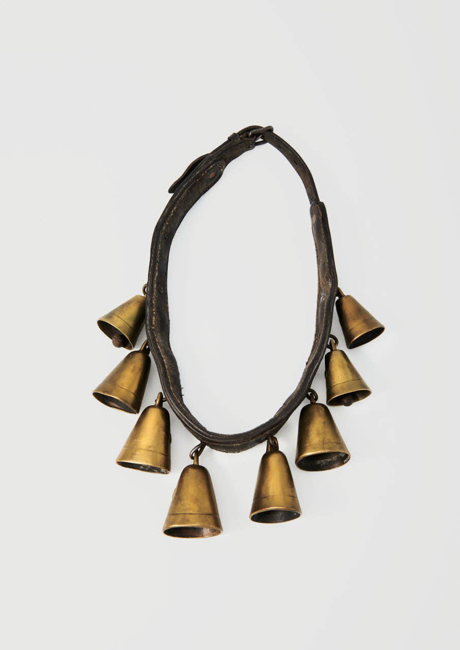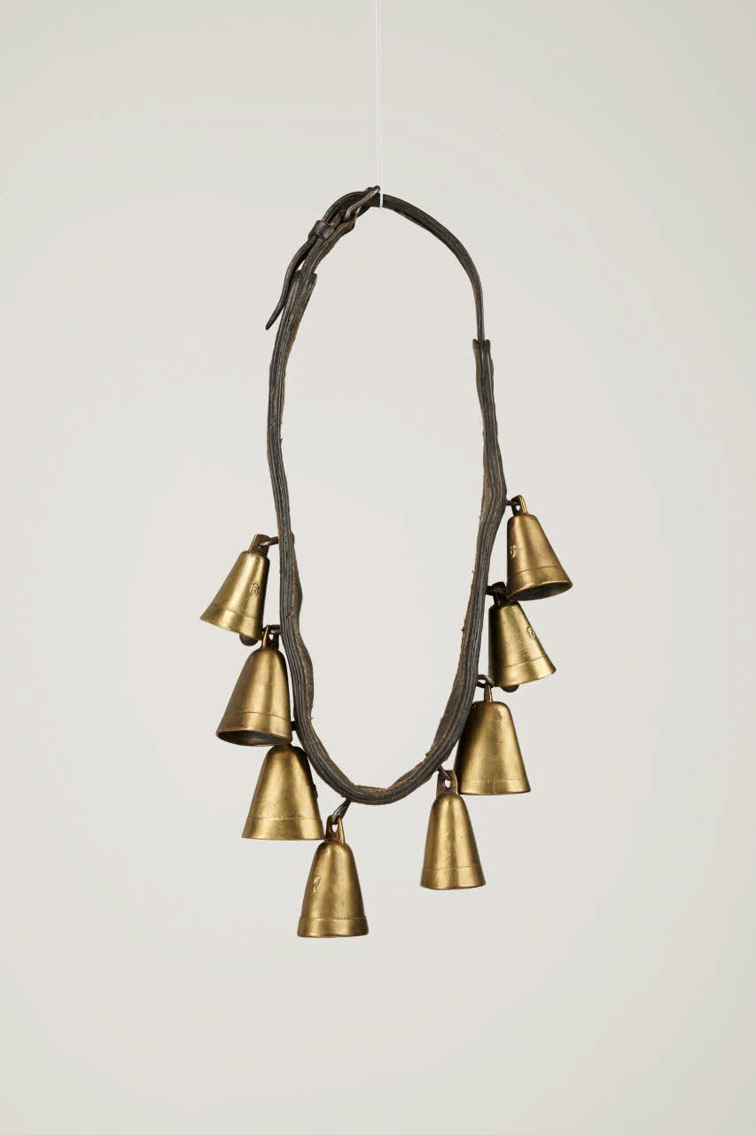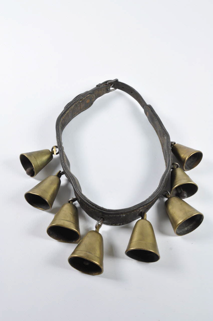 Bande de cuir doublée et cousue avec cinq clochettes n° 7 et trois clochettes n° 6, toute en cuivre et attachées par des anneaux en fer.