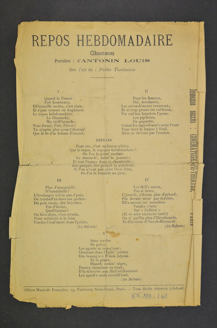 chanson, partition de musique, petit format, Repos hebdomadaire