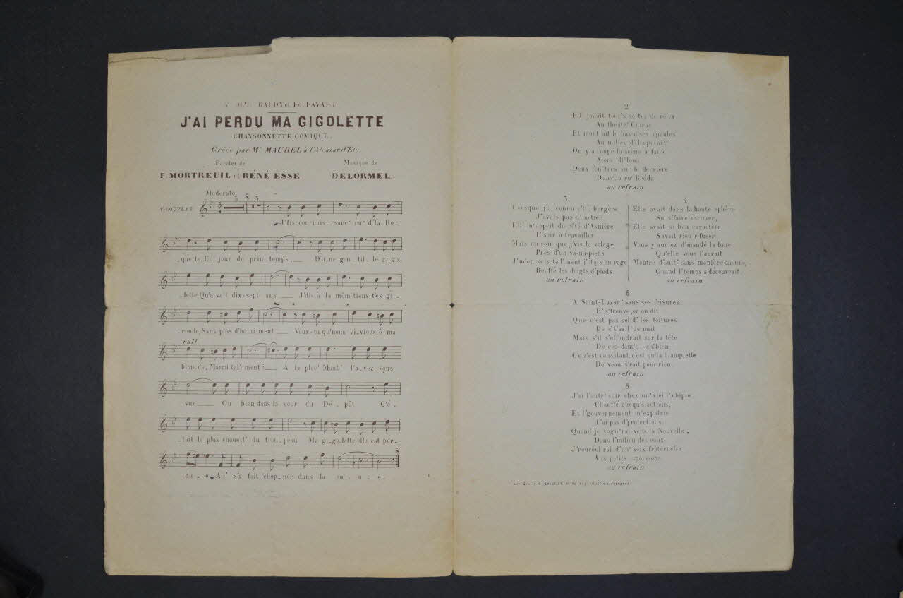 Les inscriptions renseignent le titre de la chanson, le nom des auteurs, de l'artiste et de l'éditeur. A l'intérieur, partitions et paroles de la chanson. Au dos, liste d?autres partitions publiées par l?éditeur.Décor