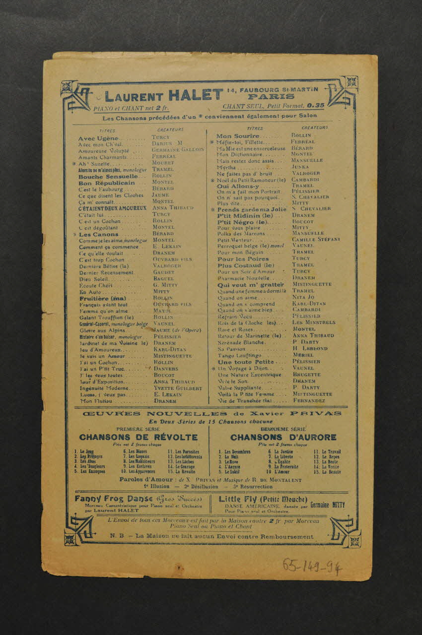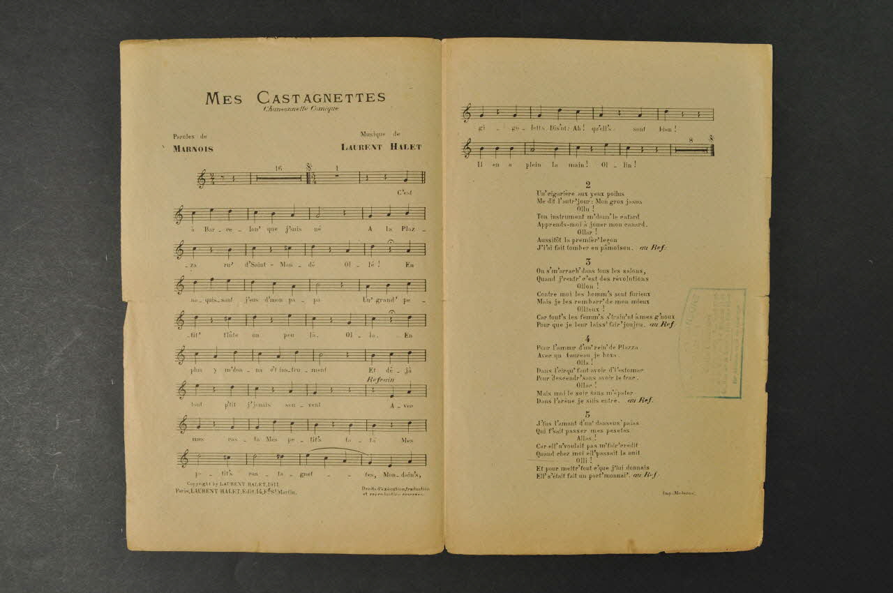 Les inscriptions renseignent le nom des auteurs, de l'artiste et de l'éditeur. A l'intérieur se trouvent la partition et les paroles de la chanson. Au dos, une liste d?autres partitions publiées par l?éditeur.Décor