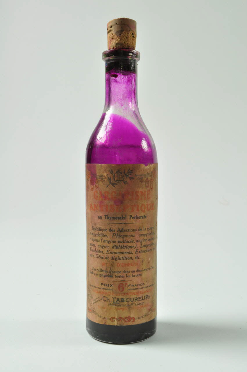 En verre moulé, de section circulaire, présentant des graduations moulées sur la paroi, à haut col rétréci, fermé par un petit bouchon de liège. La bouteille, marquée d'étiquettes, contient un liquide violet.Inscriptions