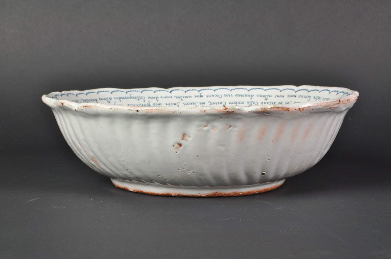 Saladier circulaire, à bords galbés, chantournés et godronnés. Fond gris et décor peint en bleu. Sur le bord intérieur, filet festonné. Pied couronne percé de deux trous de fixation. Au pied d'un arbre : trois femmes tentent de faire descendre les hommes juchés sur les branches en leur offrant des cadeaux, trois autres en abattant l'arbre, un amour au sommet. A droite, Sainte Marguerite sur le dragon. Inscription 'l'arbre d'amour-1773' avec poêmes.Inscriptions