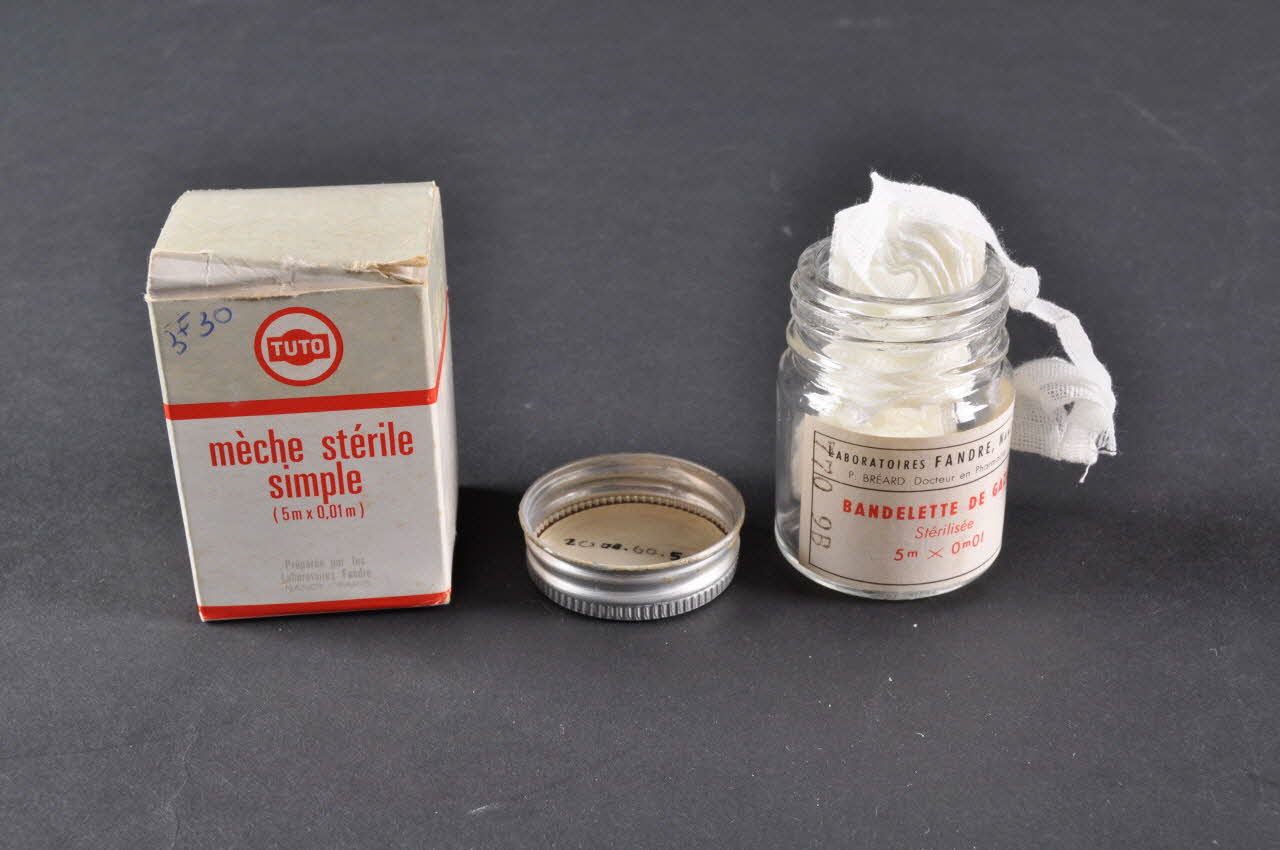 Il s'agit d'une vingtaine de bandelettes de gaze blanche contenues dans un flacon (.2).Matériaux et techniques