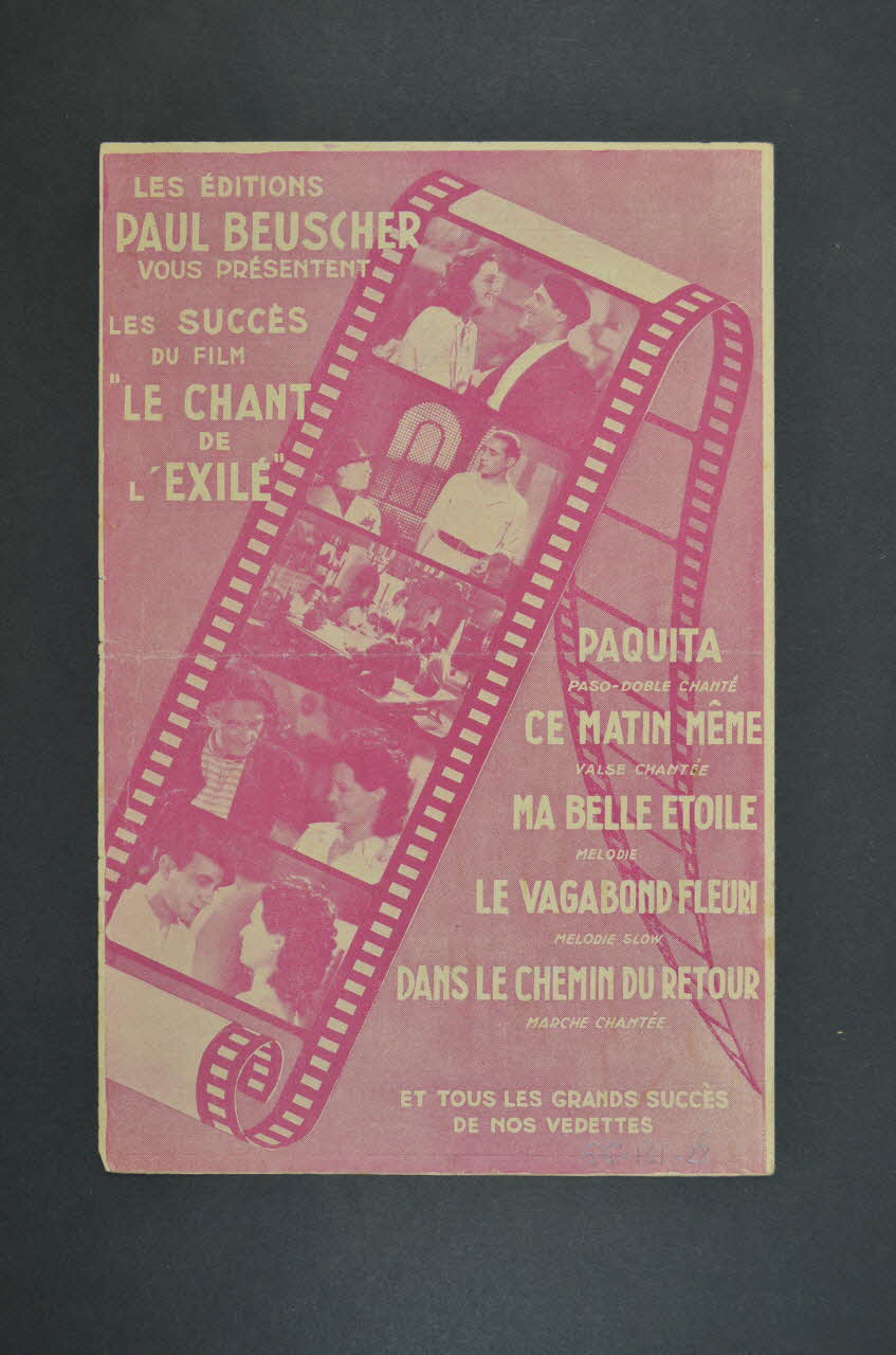 Sur la couverture, représentation d'une pellicule photographique dont les vignettes illustrent des scènes du film dont le morceau publié est extrait ; à l'arrière-plan, à droite, vue d'un village de Méditerranée et, à gauche, plage avec palmier. Les inscriptions renseignent le titre de la chanson et du film, le nom des auteurs, de l'artiste et de l'éditeur. A l'intérieur, partition et paroles de la chanson. Au dos, représentation d'une pellicule photographique dont les vignettes illustrent des scènes du film dont le morceau publié est extrait et liste d'autres partitions issues du film publiées par l'éditeur.Décor