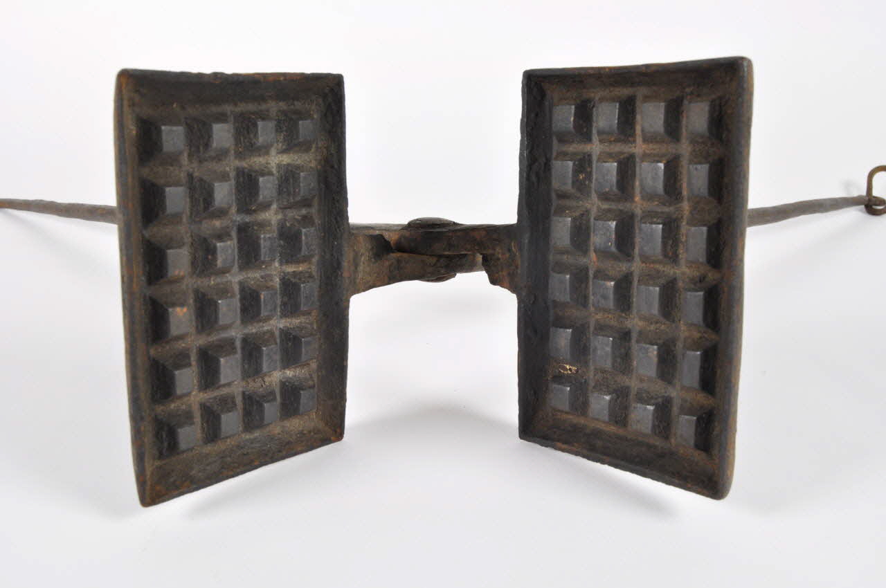 Fer forgé et estampé à chaud / Gaufrier avec deux branches cylindriques en fer forgé terminées par deux plaques rectangulaires en fonte rivetées aux branches et subdivisées en deux panneaux carrés.