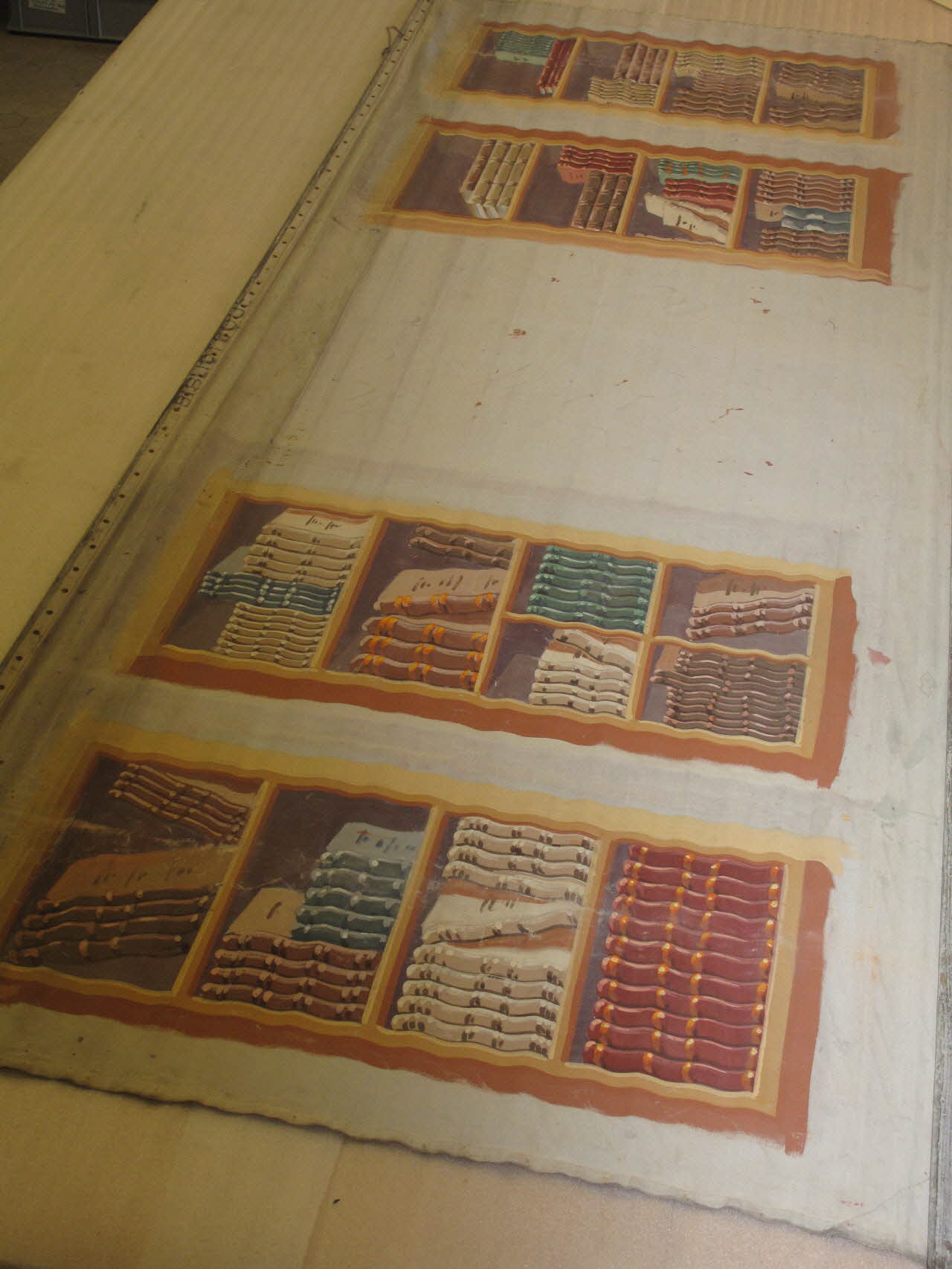 deux barres de suspension / toile peinte à la colle / décor à tranformation ; recto : salon de thé et inscription ; verso : bibliothèqueMatériaux et techniques