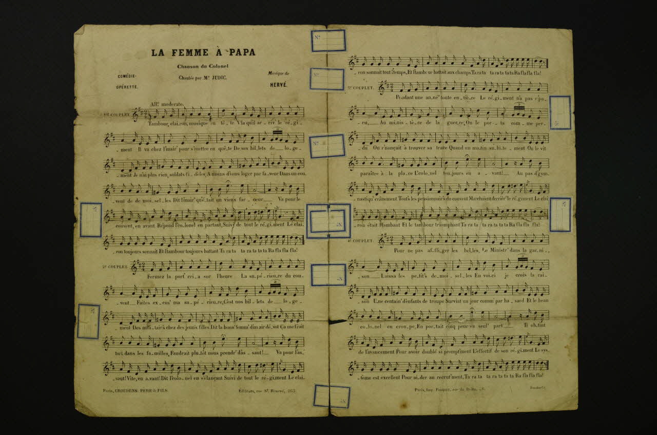 Des inscriptions renseignent le titre, les auteurs, les exécutants et l'éditeur. A l'intérieur, partition et paroles de la chanson. Au dos, liste d'autres partitions publiées par l'éditeur, avec des additions manuscrites au crayon à papier. Des petites étiquettes adhésives sont collées sur les déchirures.Décor