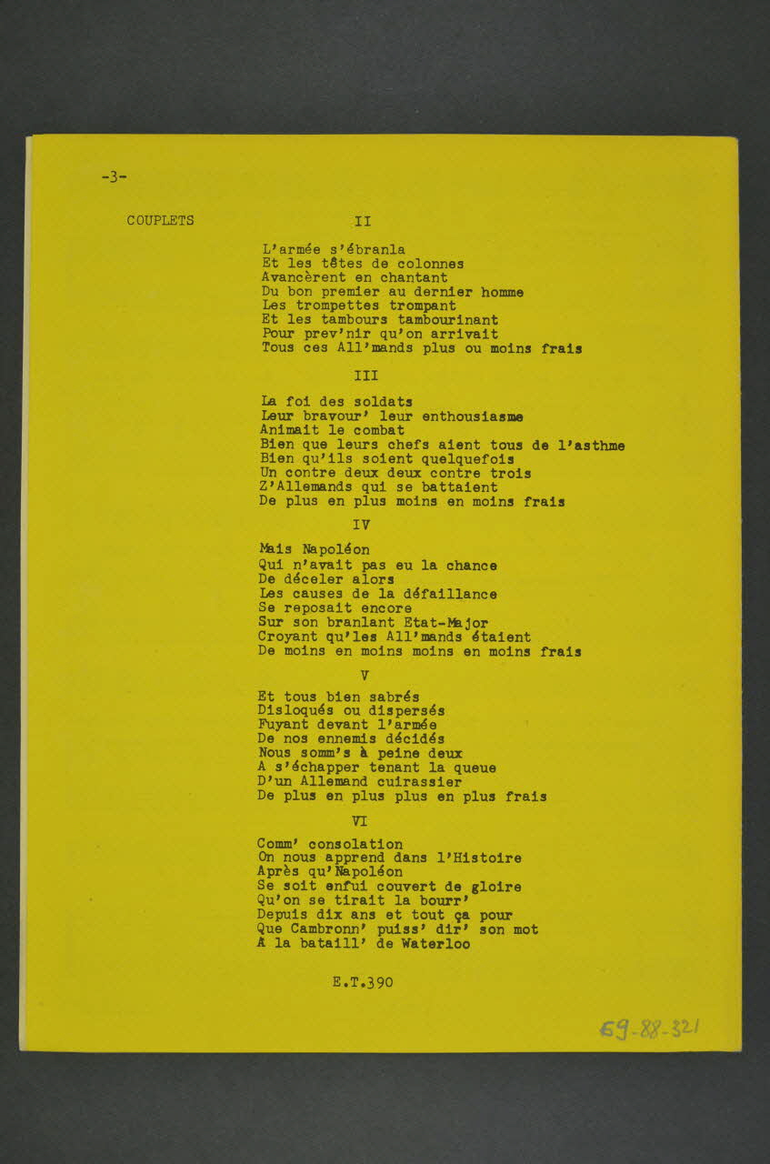 Les inscriptions renseignent le titre de la chanson, le nom des auteurs, de l'artiste et de l'éditeur. A l'intérieur, partitions et paroles de la chanson. Au dos, les paroles.Matériaux et techniques