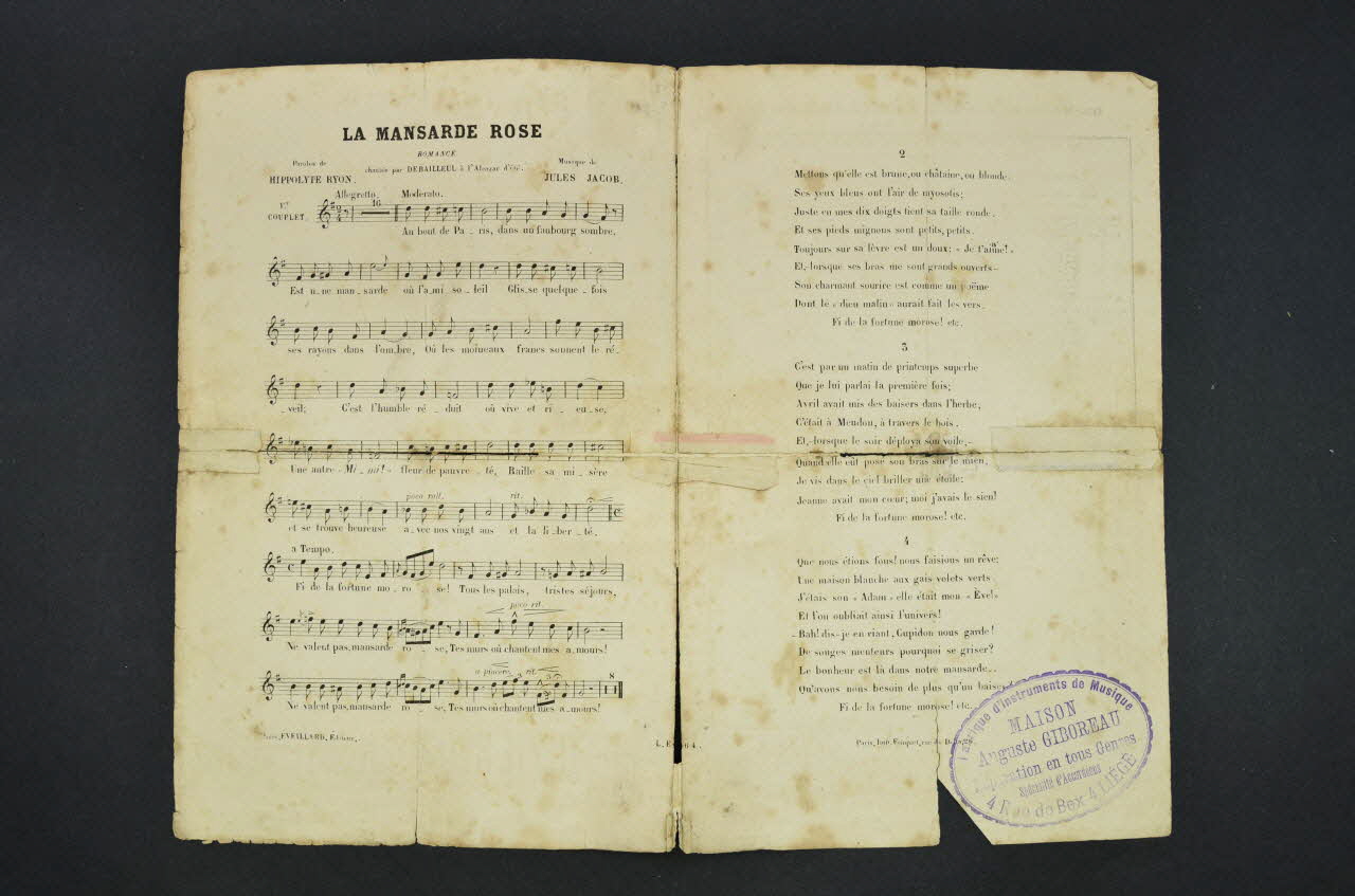 Les inscriptions précisent l'auteur de la chanson, les interprètes et l'éditeur du feuillet. L'intérieur comporte la partition et les paroles. Au dos, une liste d'autres titres disponibles chez le même éditeur.Décor