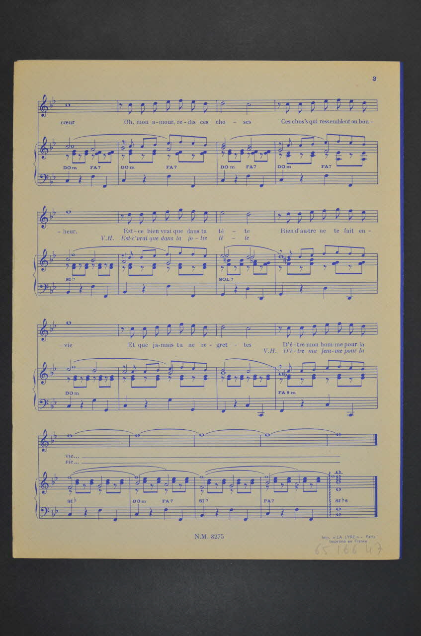 Les inscriptions précisent l'auteur de la chanson, les interprètes et l'éditeur du feuillet. L'intérieur comporte la partition et les paroles. Au dos, une liste d'autres titres disponibles chez le même éditeur.Décor