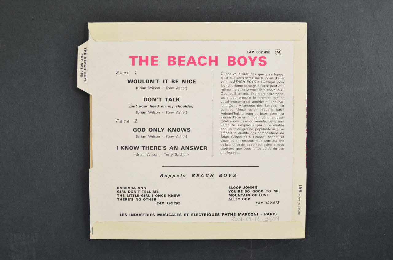 Cette pochette cartonnée, pliée, collée et plastifiée est de format carré. Une petite languette se trouve dans le haut de la bordure droite arrière.