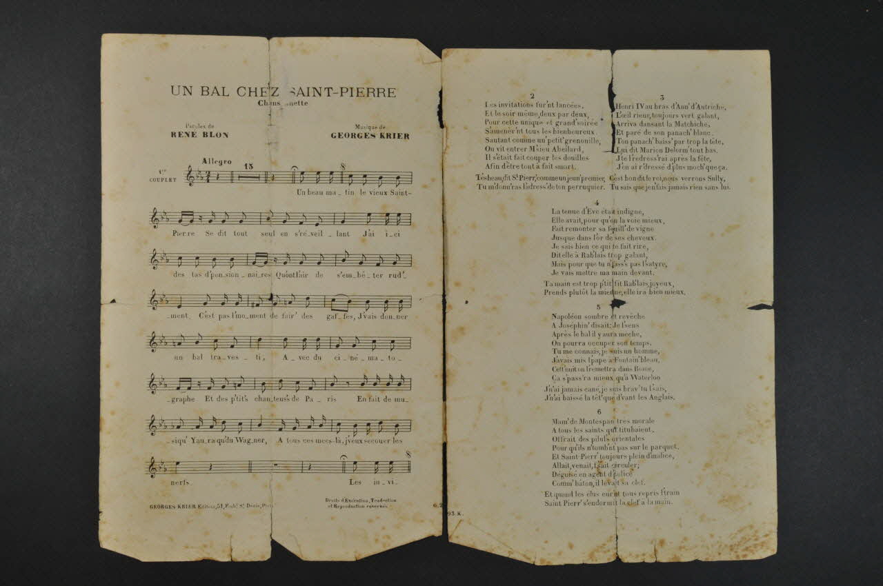 Les inscriptions renseignent le titre de la chanson, le nom des auteurs, de l'artiste et de l'éditeur. A l'intérieur, la partition et les paroles. Au dos, une liste de titres disponibles chez le même éditeur.Matériaux et techniques