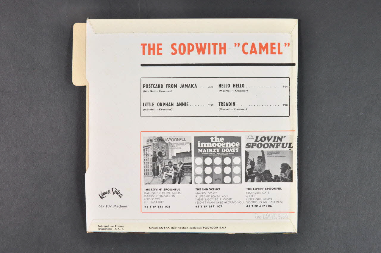 Pochette de disque de forme carrée, en carton plié et collé. Le recto présente du texte (nom du groupe, titre du premier morceau...) dans la partie supérieure ainsi que la photographie en couleur des cinq membres du groupe, au pied d'un arbre centenaire. Une languette dans la partie supérieure droite indique le nom du groupe. Le verso présente à la fois le nom du groupe, les titres et la durée des morceaux présents sur le disque, le nom de leurs auteurs ainsi que les références d'autres succès de la maison d'édition.