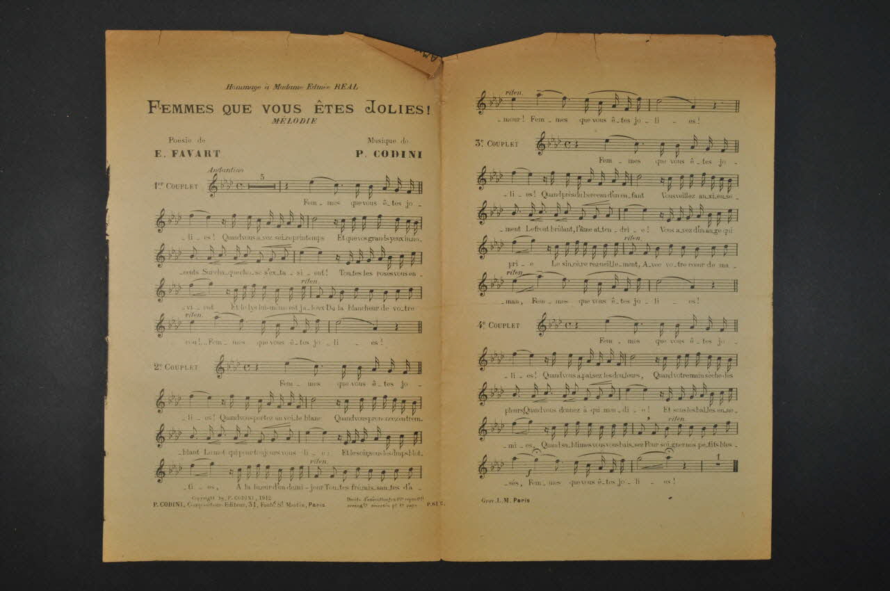 Les inscriptions renseignent le titre de la chanson, le nom des auteurs, de l'artiste et de l'éditeur. A l'intérieur, partitions et paroles de la chanson. Au dos, liste d?autres partitions publiées par l?éditeur.Décor