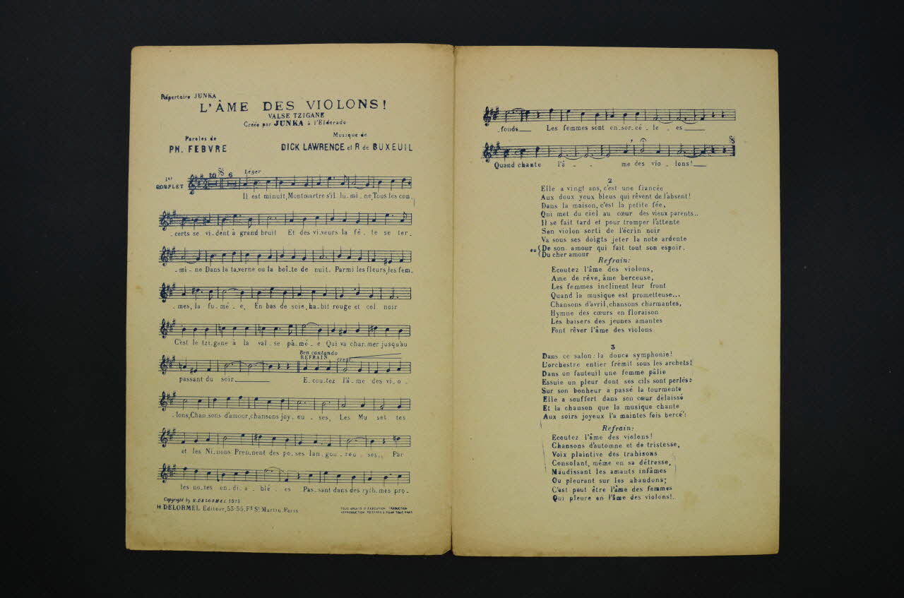 Feuillet rectangulaire en papier industriel, imprimé à l?encre bleue et brune (sauf l?intérieur à l?encre noire). La couverture du feuillet présente la photographie de Junka, et le dessin d'une violoniste.