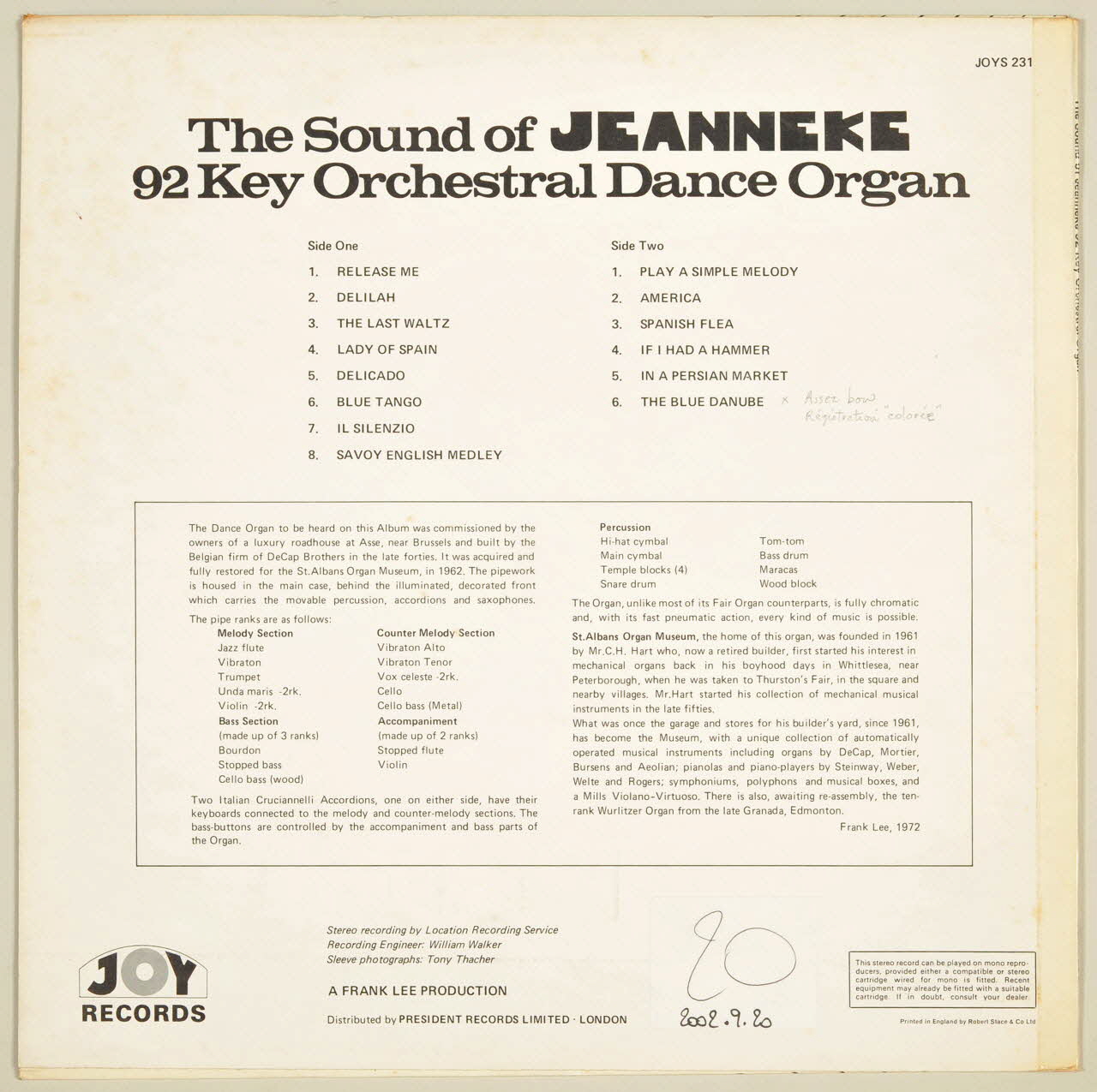 Au recto de la pochette, plusieurs photographies d'instruments de musique mécanique.