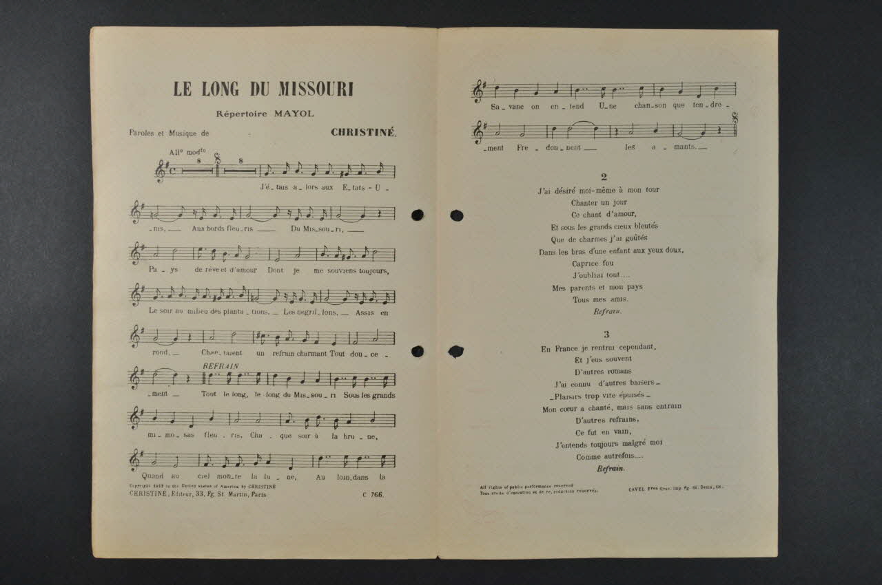 Sur la couverture, le portrait photographique de Mayol, la main devant la bouche, à gauche, arbre avec racines stylisé et à droite, vase avec mimosas. Les inscriptions renseignent le titre de la chanson, le nom des auteurs, de l'artiste et de l'éditeur.