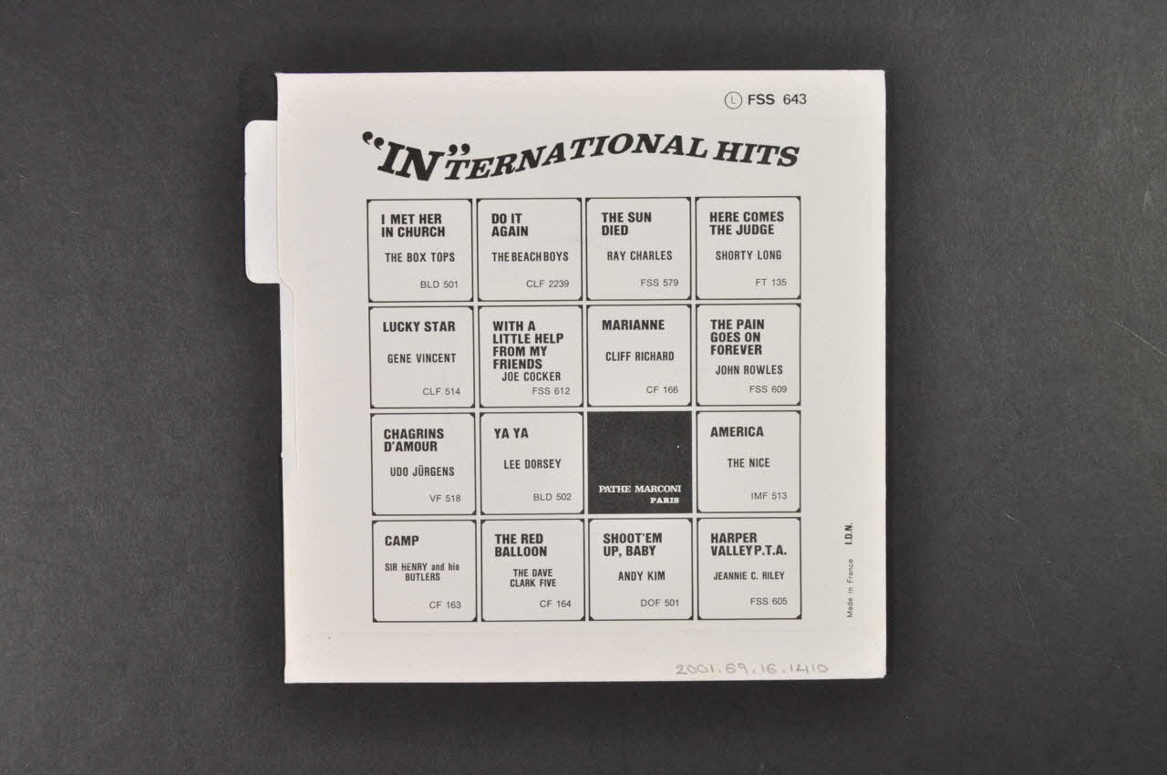 Au recto figurent le nom du chanteur et le titre des chansons à droite sur fond violet. A gauche, une photographie noir et blanc représente l'artiste en train de chanter. Le logo de l'éditeur est présent dans le coin supérieur gauche. Un onglet blanc contenant des inscriptions noires se trouve dans le coin supérieur droit. Le verso comporte diverses inscriptions dans des carrés noirs sur fond blanc.Matériaux et techniques