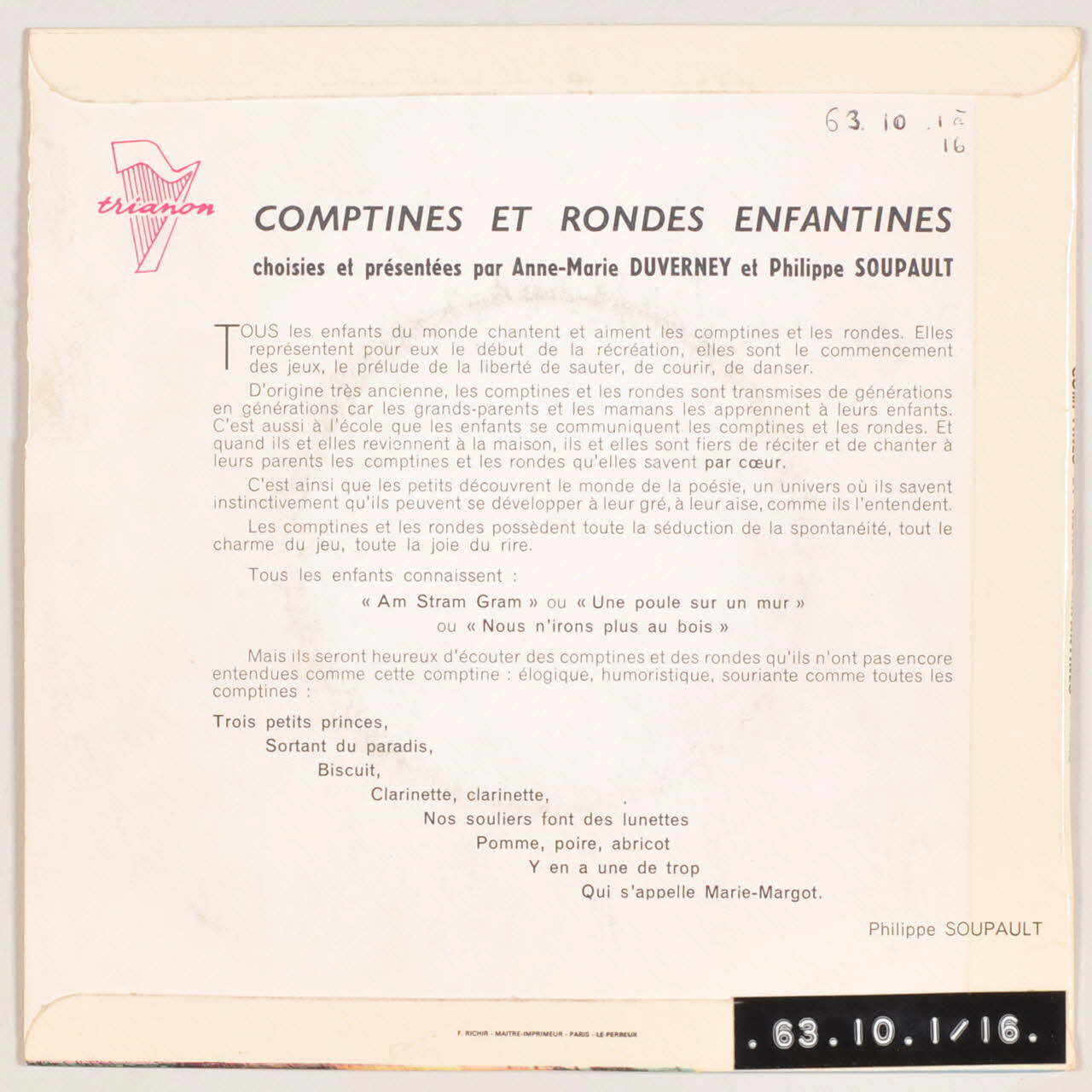 Lieu : FranceDate : 1963Collecteurs :Acquisition