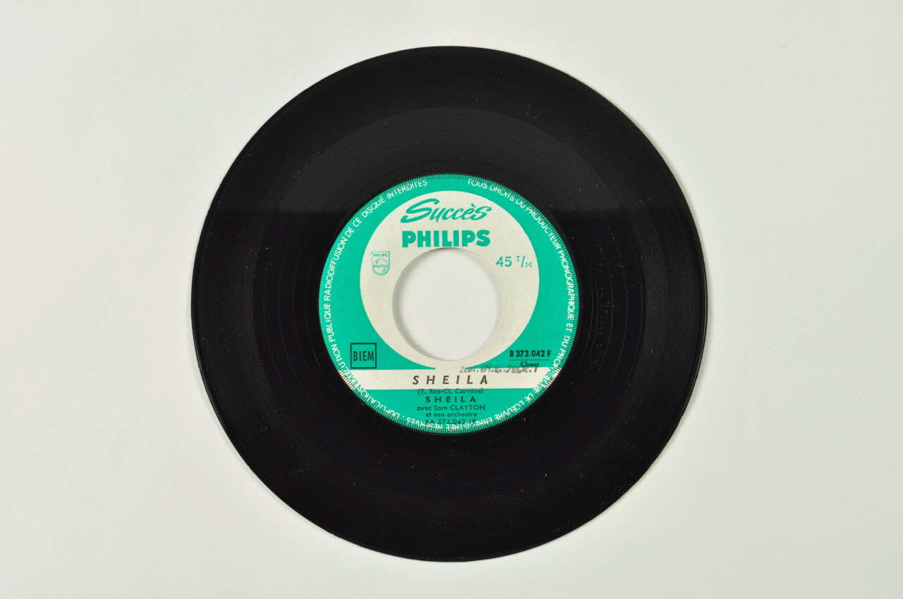 Le disque rond et noir comporte une perforation circulaire au centre. Une étiquette verte et blanche contenant le nom du chanteur, le titre des chansons, le logo de l'éditeur ainsi que d'autres inscriptions en noir est collée au centre.