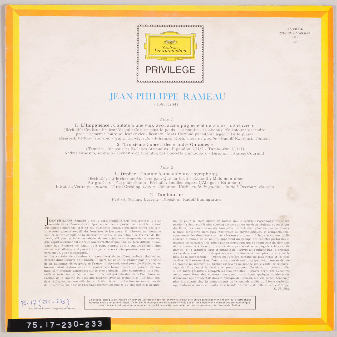 disque 33 tours, Les Indes Galantes, Orphée, L'impatience