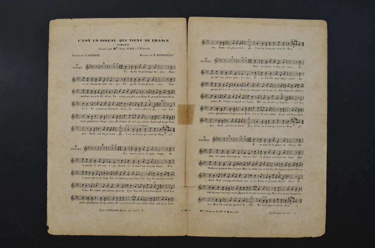 papier imprimé / Feuillet rectangulaire en papier industriel imprimé à l'encre. A l'intérieur, partitions et paroles de la chanson. Au dos, publicité pour l'éditeur.