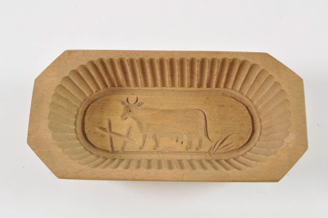 En bois, de forme rectangulaire à coins coupés, à bords bas et légèrement évasés. Sur le fond, une vache est gravée. Les côtés intérieurs sont couverts de rainures verticales.
