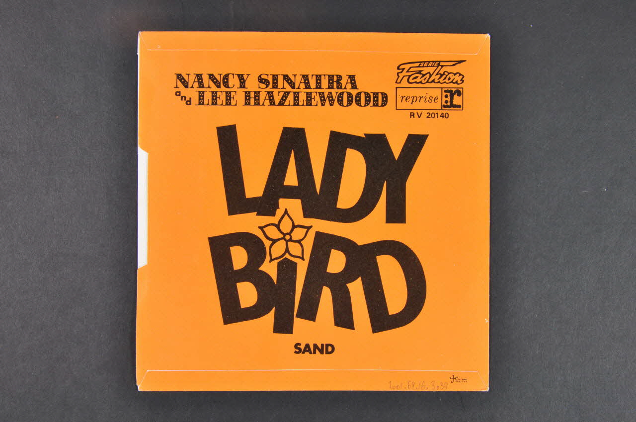 Pochette de disque de forme carrée, en papier plié et collé. Le recto et le verso sont identiques. Ils comportent tous deux des inscriptions en noir sur fond orange. Le texte indique le nom des interprètes (dans la partie supérieure) et le titre du morceau (au centre). Une fleur fait office de point sur le "i" contenu dans le titre.Matériaux et techniques
