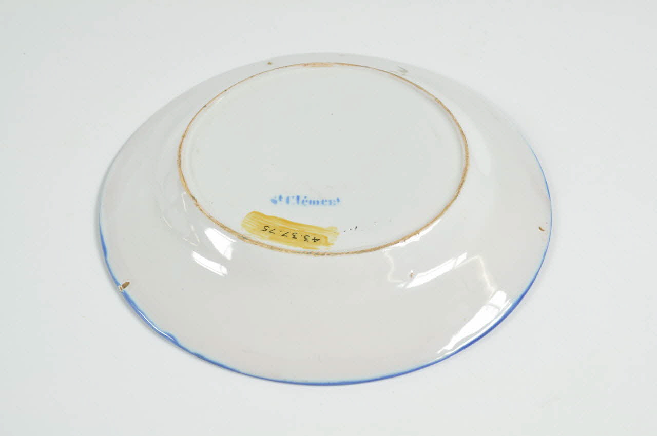Assiette en faïence blanche ronde. Sur le marli est peint un filet bleu et des fleurettes bleus et rouges et des arabesques rouge. Au fond est peinte une corbeille bleue à deux anses avec bouquet de quatre fleurs jaunes, bleues et rouges avec du feuillage vert.Décor