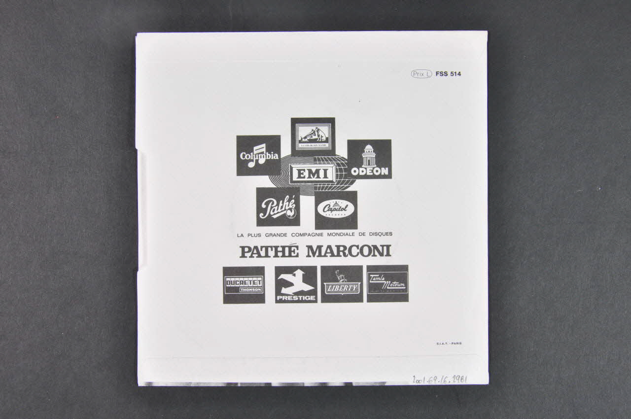 Pochette de disque de forme carrée, en papier plié et collé. Le recto présente du texte (nom de l'artiste, titres des morceaux...) en rouge et en noir sur fond blanc (partie supérieure et latérale gauche) ainsi que la photographie en noir et blanc de l'artiste en buste (partie inférieure). Le verso présente les logos de différentes maisons de disques.Matériaux et techniques