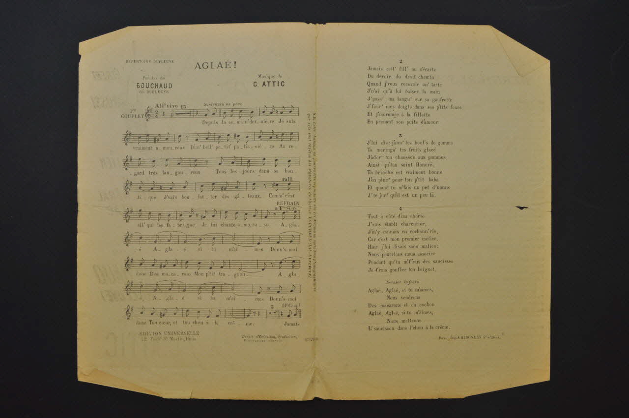 Sur la couverture, la représentation d'un militaire dansant. Les inscriptions renseignent le titre de la chanson, le nom des auteurs, des artistes et de l'éditeur. A l'intérieur, partition et paroles de la chanson. Au dos, liste d'autres partitions publiées par l'éditeur.Décor