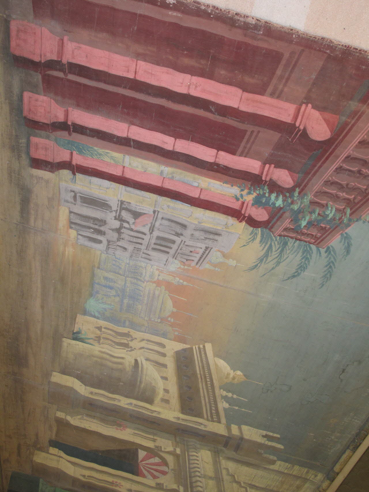 toile ajourée, peinte à la colle fixée à chaque extrémité entre deux baguettes de bois pour la suspension clouées entre elles / La toile de fond représente au recto une place orientale, un marché aux femmes et au verso le canon utilisé pour "De la Terre à la Lune" de Jules Verne.Inscriptions