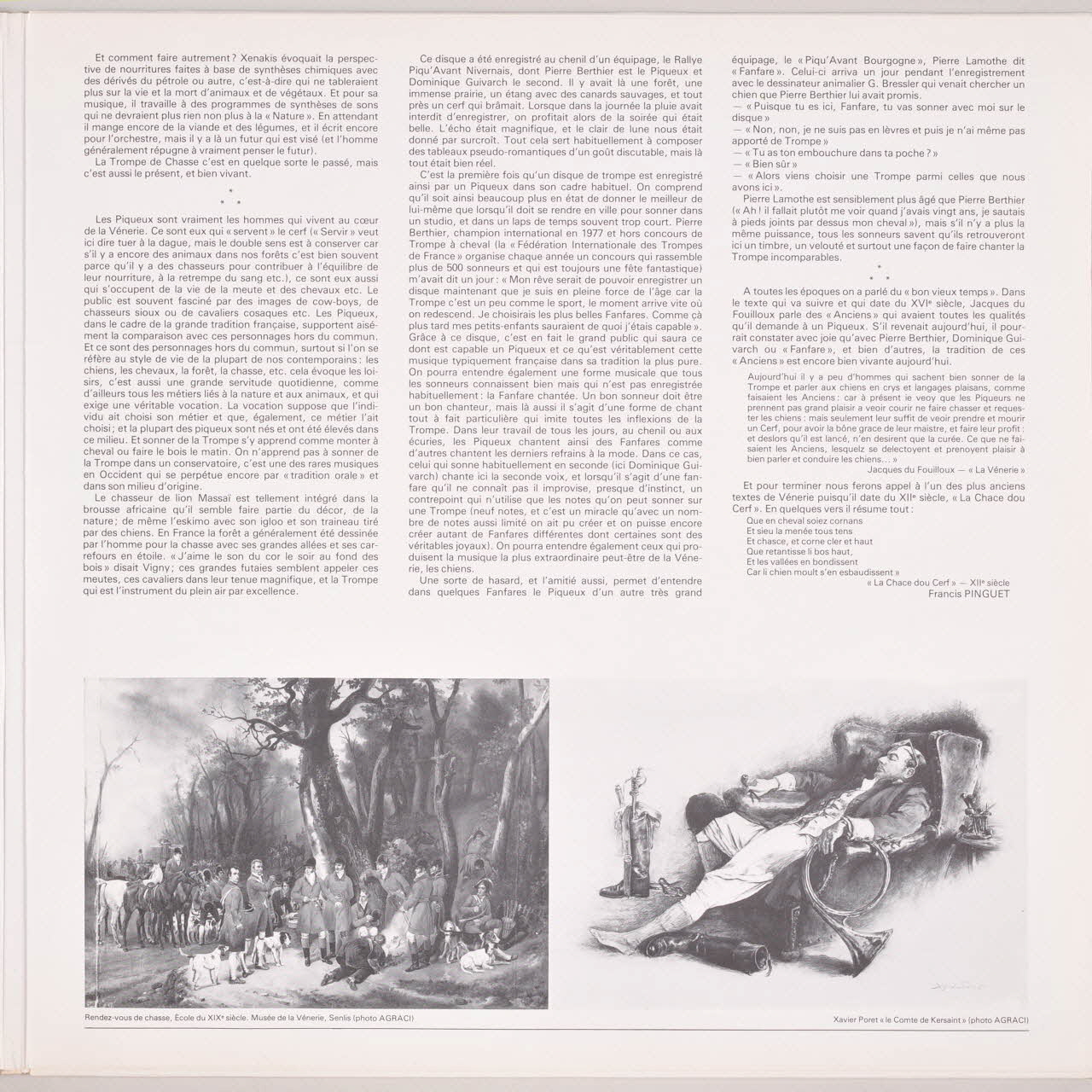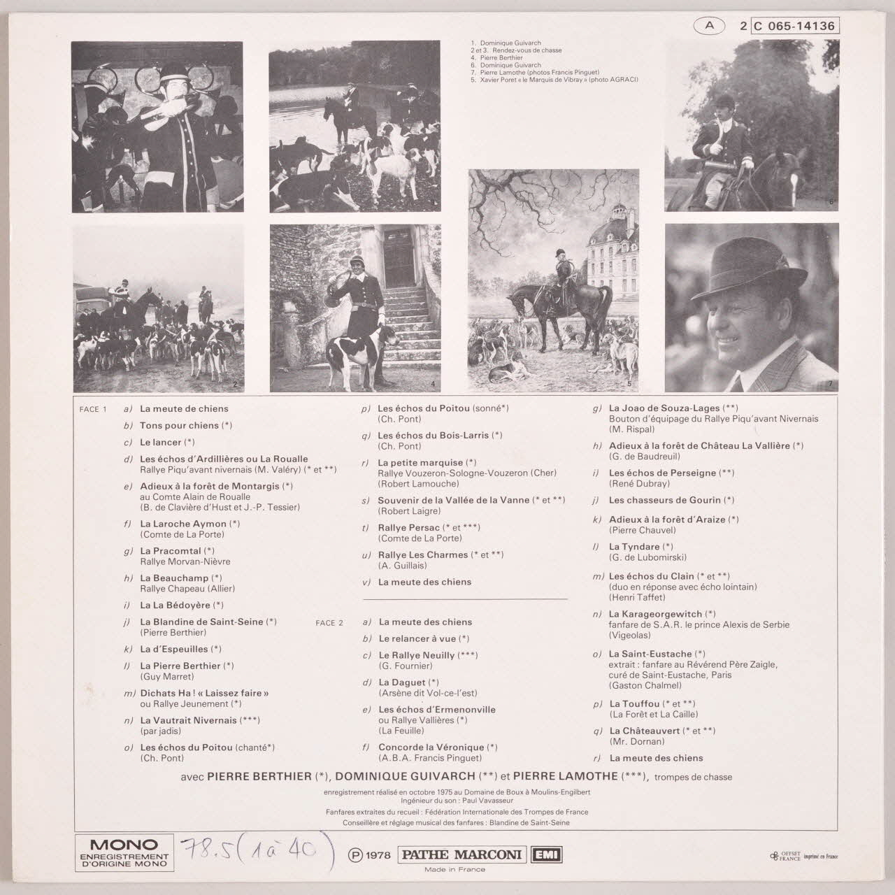 Au verso de la pochette, des photographies noir et blanc de sonneurs et de meutes. Des inscriptions sur les deux faces de la pochette et sur l'étiquette rouge du disque renseignent les titres et les exécutants de l'album. En partie supérieure, le logo du label discographique représentant un chien assis devant un gramophone. A l'intérieur de la pochette, un texte explicatif illustré de photographie, dessin et peinture.Matériaux et techniques
