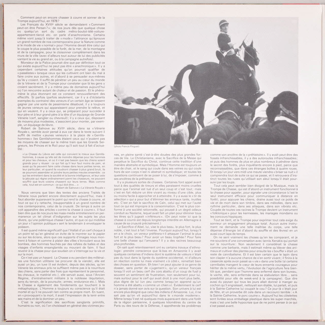 La pochette du disque présente, au recto, une peinture représentant une scène de chasse avec des cavaliers, des sonneurs et une meute de chiens dans la forêt.