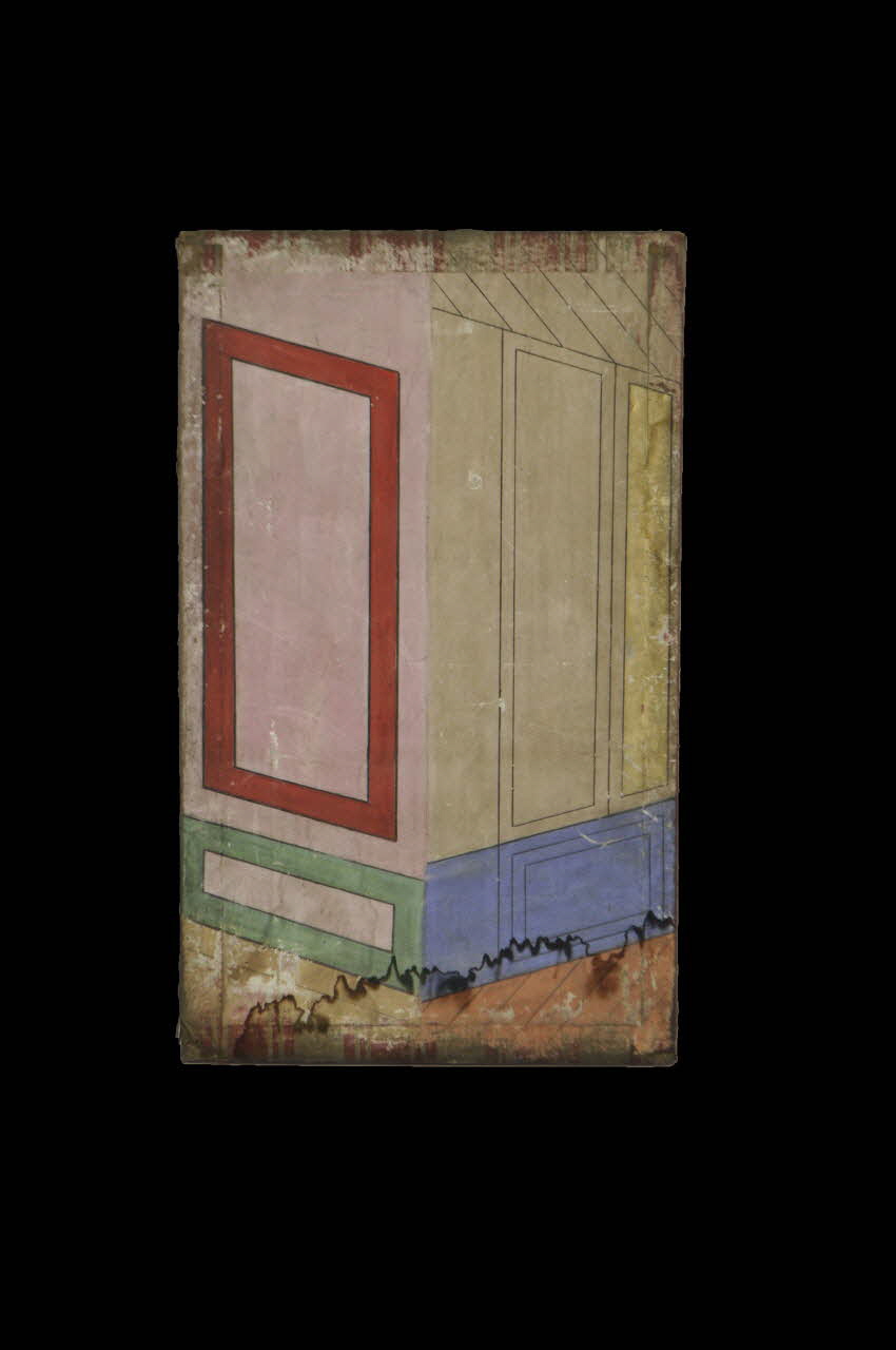 Le décor peint se retrouve sur les deux faces. La première montre un intérieur d'appartement avec des lambris de couleurs rouge, vert et bleu. La seconde présente également un décor d'intérieur d'appartement avec un élément peint en bleu foncé.Matériaux et techniques