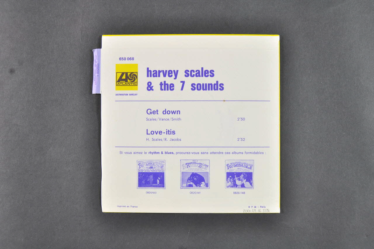 Le recto comporte une photographie noir et blanc de tickets. Le nom des artistes et les titres des chansons sont inscrits dans la partie supérieure en violet sur un fond jaune. Le logo de l'éditeur est au centre de la partie inférieure. Le verso contient le nom des artistes, les titres des chansons, et le logo de l'éditeur sur fond blanc. Trois autres albums sont présentés dans la partie inférieure. Un onglet violet avec des inscriptions violettes est situé le long de la bordure gauche.Matériaux et techniques