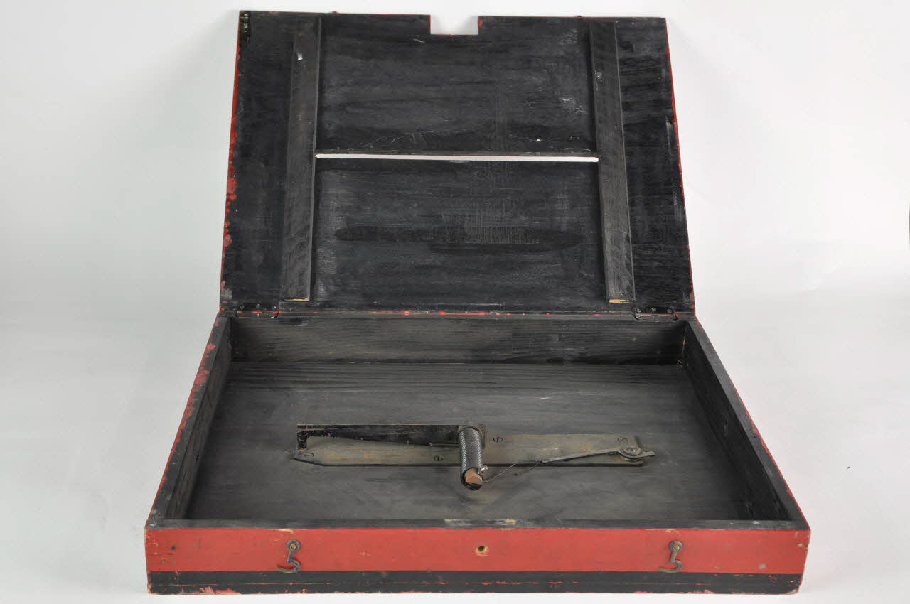 Le couvercle présente un petit évidement rectangulaire sur le devant et un long et fin évidement à bords arrondis sur le milieu. A l'intérieur figure un système métallique avec un ressort. L'intérieur de la boîte est peint en noir, tandis que l'extérieur est en rouge et noir, et le couvercle en rouge avec un damier noir dans lequel figurent des ronds dorés. Une vis avec un écrou accompagnent l'objet.Matériaux et techniques