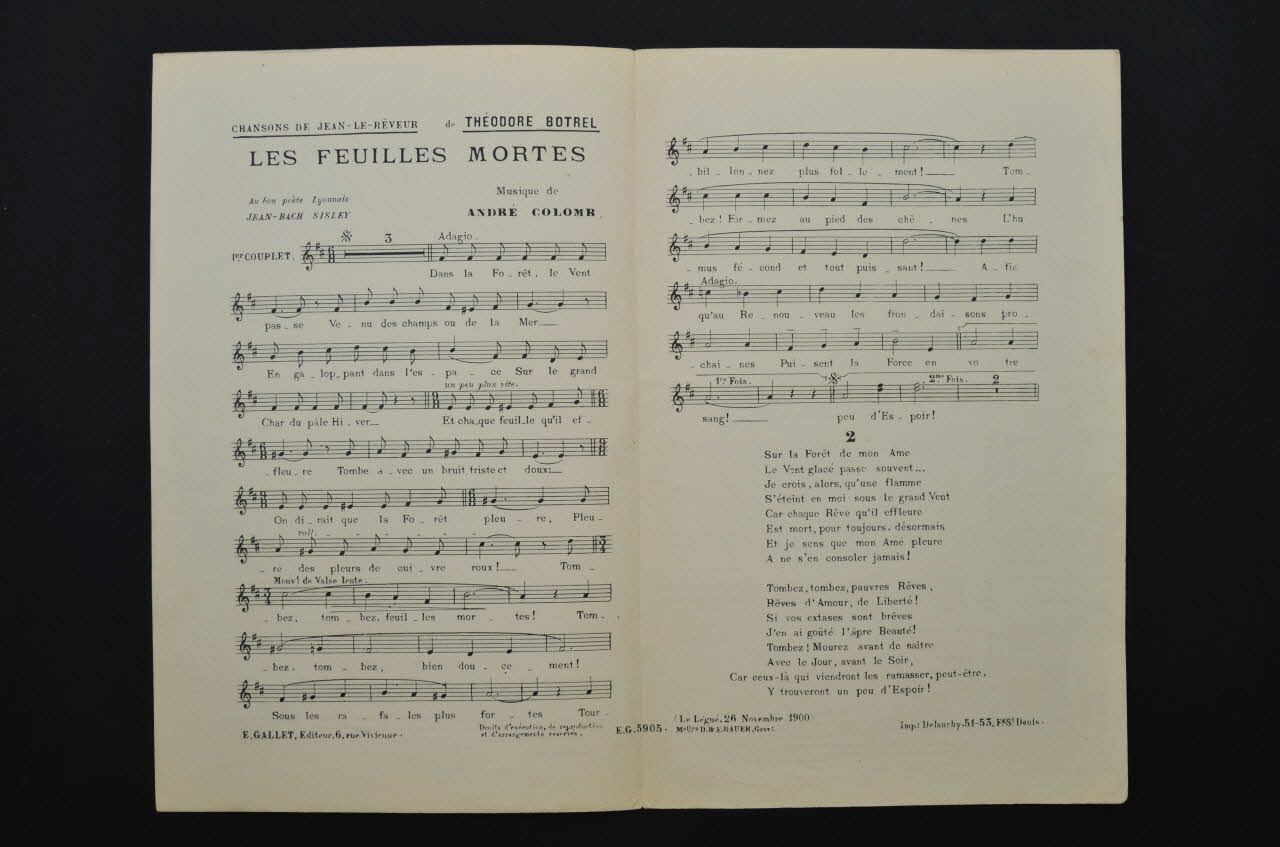 Sur la couverture, la représentation d'un veil homme en costume traditionnel breton, levant son chapeau et s'appuyant sur sa canne. Les inscriptions renseignent le titre de la chanson, le nom des auteurs, de l'artiste et de l'éditeur ; au centre droit, tableaux récapitulatifs d'autres collections de partitions publiées par l'éditeur.