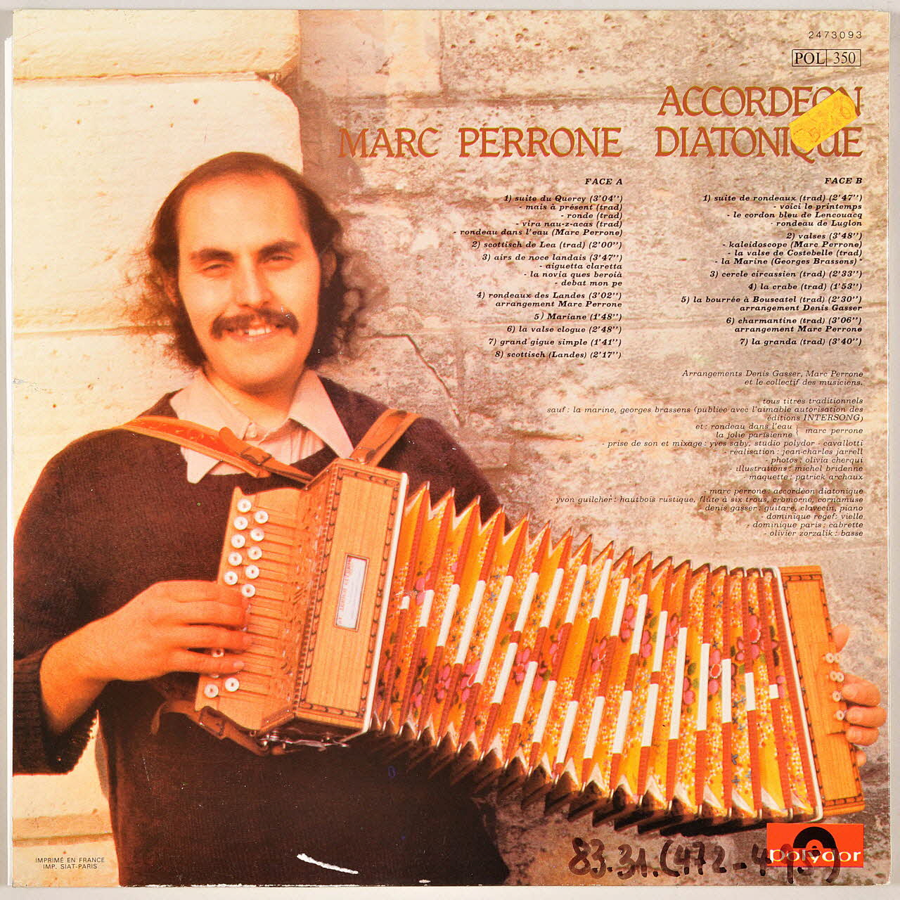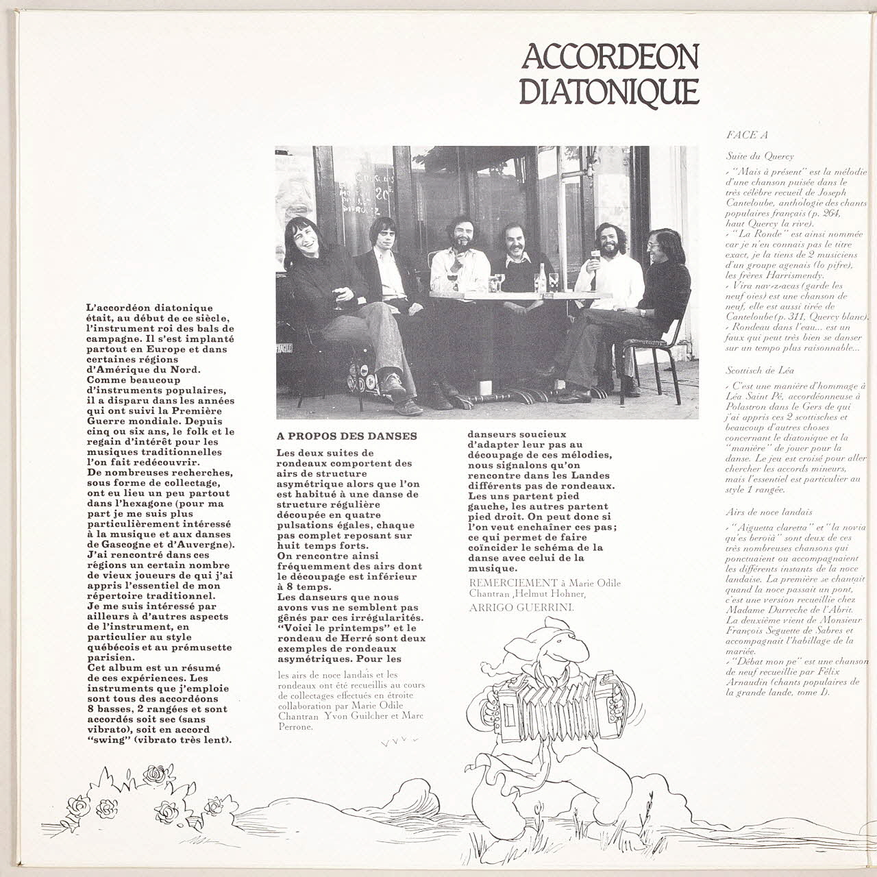 Au verso, une photographie de Monsieur Marc Perrone jouant de l'accordéon diatonique. A l'intérieur de la pochette, des textes explicatifs sur les différentes chansons du disque. Des inscriptions sur les deux faces de la pochette et sur l'étiquette rouge du disque renseignent les titres et les exécutants de l'album.Décor