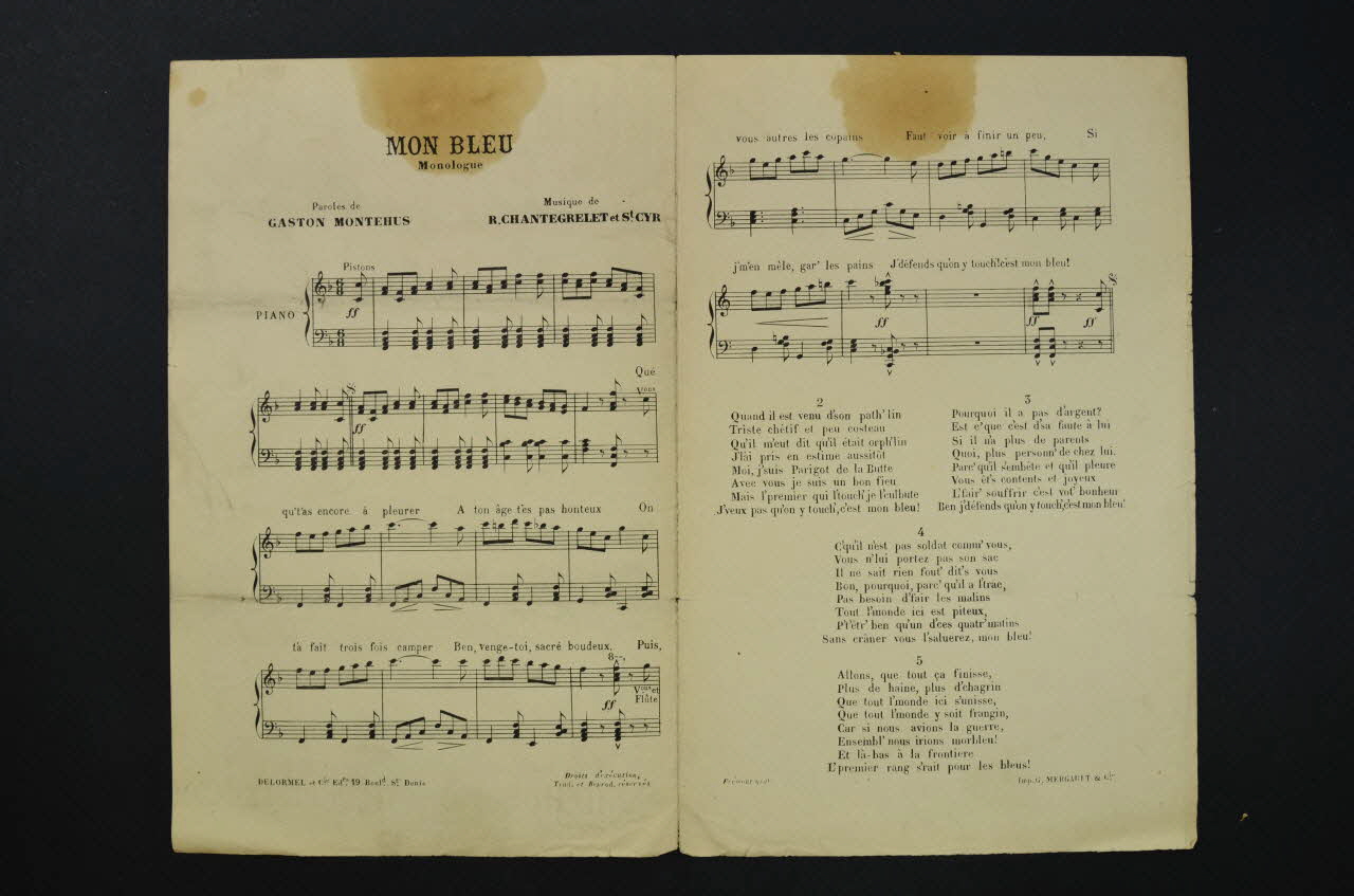 Les inscriptions renseignent le titre de la chanson, le nom des auteurs, de l'artiste et de l'éditeur. A l'intérieur, partition et paroles de la chanson. Le revers est laissé vierge.Décor