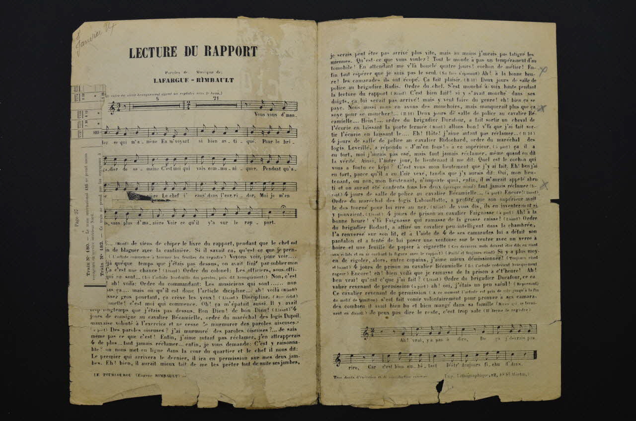 papier imprimé / Feuillet rectangulaire en papier industriel, imprimé à l?encre noire. Partition en mauvais état de conservation avec nombreux dépôts de papier imprimé encollé dus à une réparation antérieure.