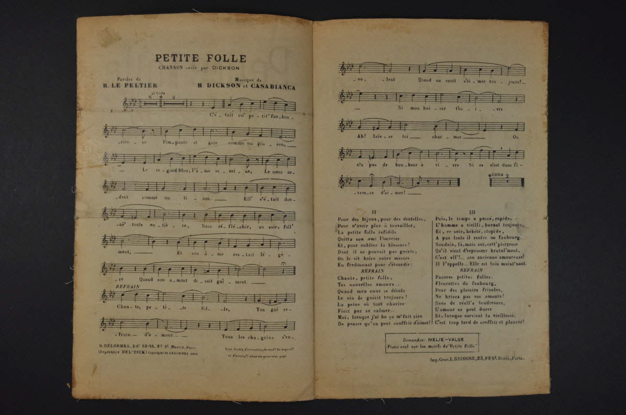Des inscriptions renseignent le titre, les auteurs, les exécutants et l'éditeur. A l'intérieur, partition et paroles de la chanson. Au dos, liste d'autres partitions publiées par l'éditeur. Le feuillet est recouvert d'un textile blanc semi-transparent.Matériaux et techniques