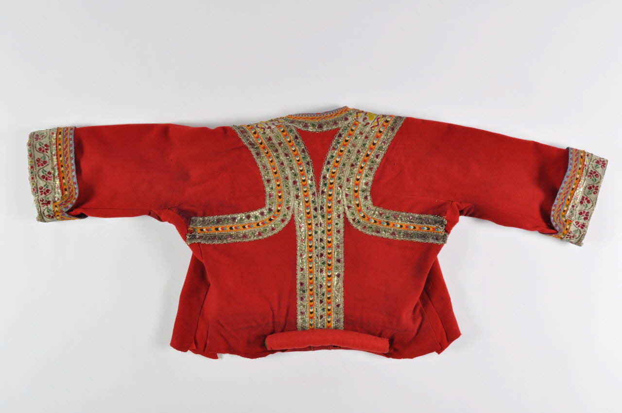 En drap de laine rouge, cour, à manches trois-quarts et large encolure, entièrement ouvert sur l'avant ; des galons de fils métalliques blancs, peints de motifs floraux, sont brodés au bord des pans et des manches ; des petits galons de fils métalliques et de broderies de fils de coton bleux, rouges et orange sont disposés le long des galons plus large et au centre du dos ; un petit boudin de drap est fixé dans le bas du dos.Matériaux et techniques