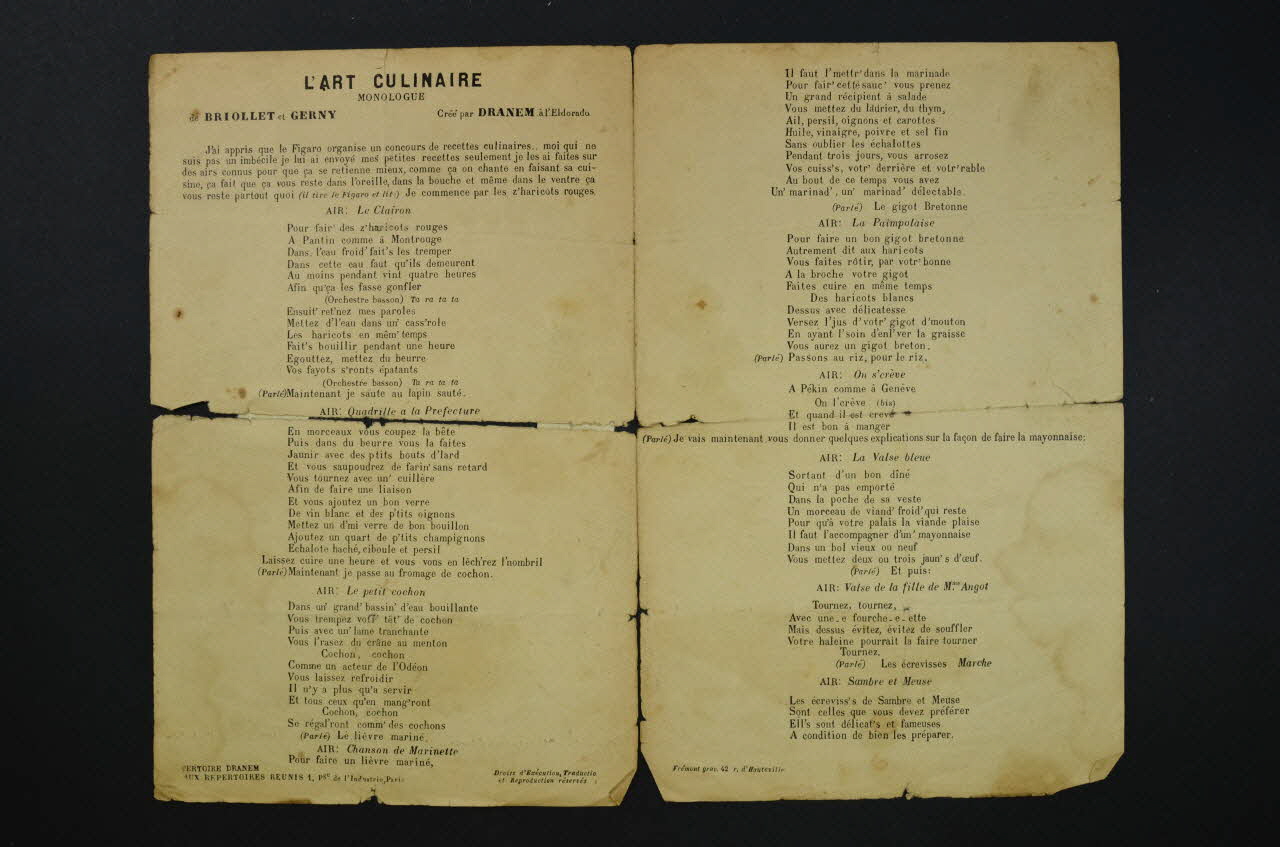 Feuillet rectangulaire en papier industriel, imprimé à l?encre noire. La couverture du feuillet présente la photographie de Dranem