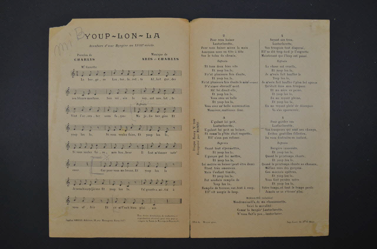 Feuillet rectangulaire en papier industriel imprimé. Le feuillet contient la partition et les paroles de la chanson. Au, dos, publicité pour l'éditeur.