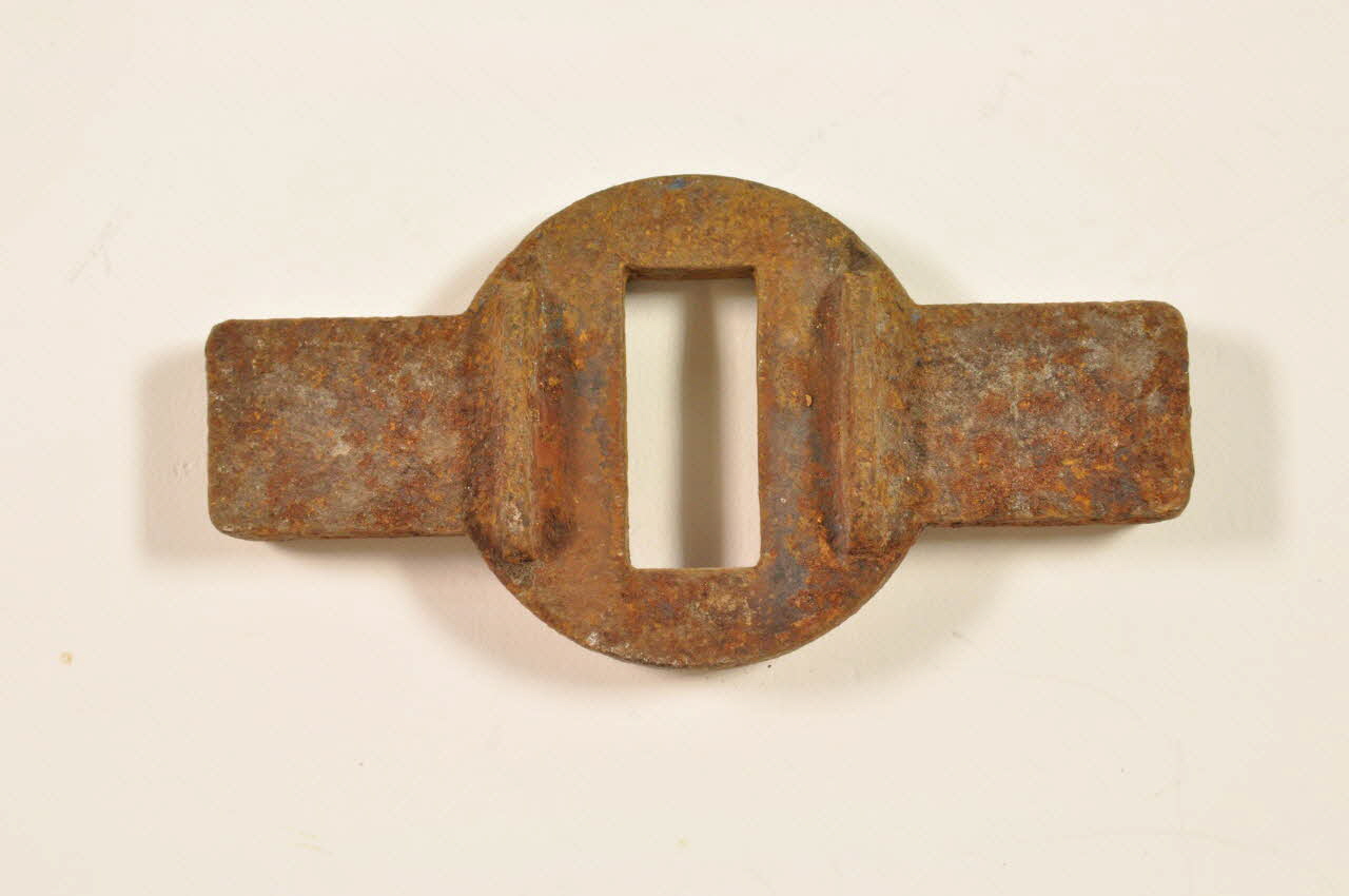 L'élément de soc est réalisé en métal moulé. Il est de forme circulaire et percé d'une fente rectangulaire. Il est muni de deux pattes latérales.Matériaux et techniques