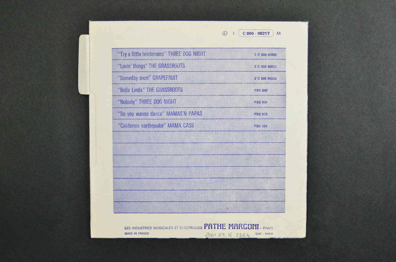 Cette pochette en papier, pliée et collée, est de format carré. Une languette contenant des inscriptions bleues se trouve dans le haut de la bordure droite.